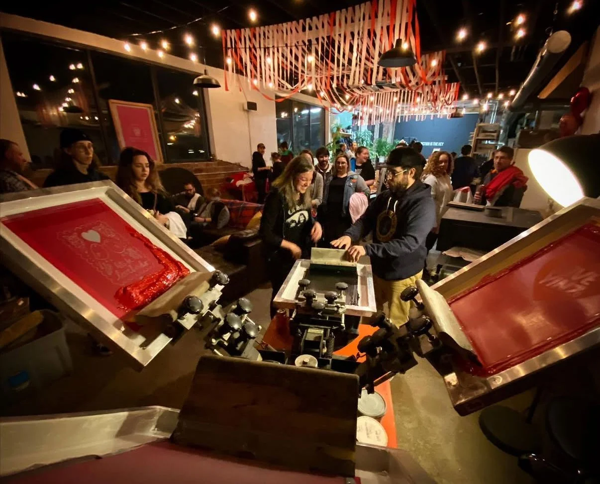 If you want something a little different and a bit more creative than your average boardroom meeting, reach out and let us know. We have done some cool on-site demos and printing with all kinds of different organizations. Our space can accommodate a decent-sized group - we can help cater lunch, dinner, or bring snacks, drinks, or whatever. Its easy to set up a press and let you and your people print your own shirt to commemorate the occasion.